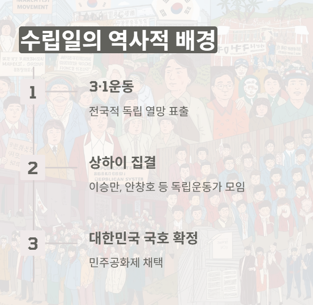 이런 역사적 사실을 정확히 아는 게 중요하죠. 임시정부 수립일의 배경을 더 깊이 알고 싶다면 국립대한민국임시정부기념관 웹사이트를 방문해 보세요.