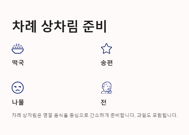 - 차례 상차림: 떡국, 송편, 나물, 전, 과일 등 명절 음식을 중심으로 간소하게 준비합니다.