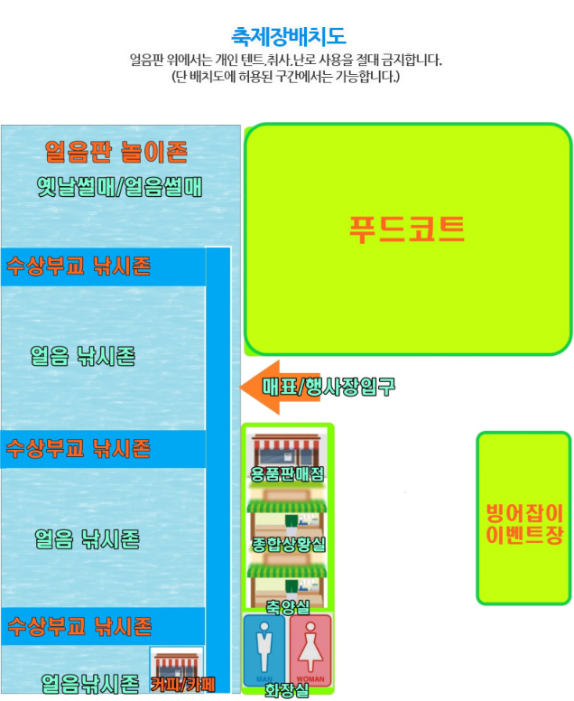 빙어낚시 대회, 가족 눈사람 만들기 대회, 전통놀이 경연대회 등 특별한 프로그램이 매일 진행됩니다. 특히 주말에는 특별 공연과 이벤트도 많아 활기찬 분위기 속에서 다양한 볼거리를 즐길 수 있습니다.