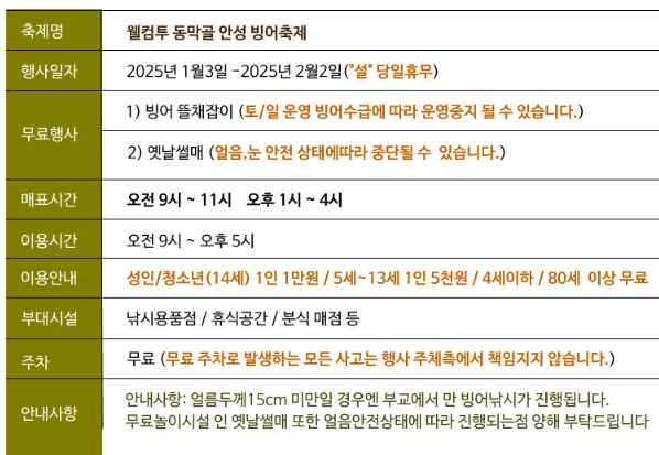 2025년 안성 동막골 빙어축제는 1월 3일부터 2월 2일까지 진행되며, 장소는 경기도 안성시 죽산면 광혜원 저수지입니다. 오전 9시부터 오후 5시까지 운영하며, 설 당일은 운영하지 않는다는 점 참고하세요. 입장료는 성인 10,000원, 어린이 5,000원으로 비교적 부담 없는 가격입니다.