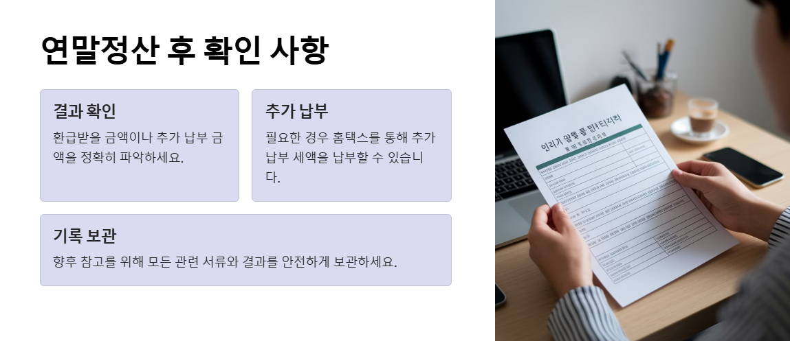 마지막으로 연말정산을 마친 후에는 꼭 결과를 확인하세요. 환급받을 금액이나 추가 납부 금액을 정확히 파악하고, 필요한 경우 홈택스를 통해 추가납무 세액을 납부할 수 있습니다.