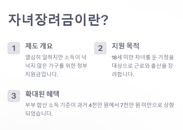 이 제도는 18세 미만 자녀를 둔 가정을 대상으로 하며, 근로와 출산을 장려하려는 목적이 있어요. 2025년에는 최신 기준에 따라 더 많은 가구가 혜택을 받을 수 있을 것으로 보입니다.