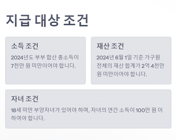 먼저, 2024년도 부부 합산 총소득이 7천만 원 미만이면서 부양자녀(18세미만)가 이어야 해요. 여기서 총소득은 근로소득, 사업소득, 종교인소득 등을 모두 합친 금액을 뜻합니다.