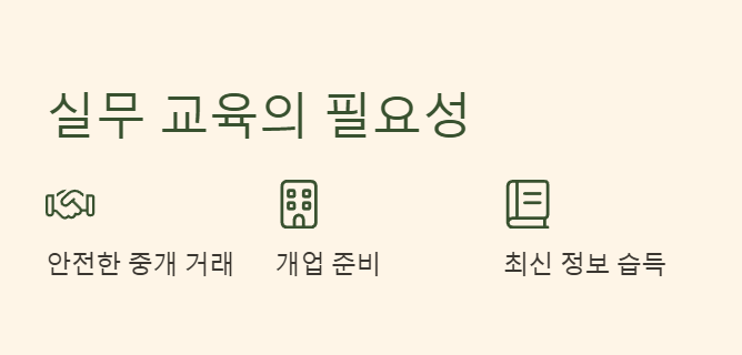"공인중개사 실무 교육은 필수 과정인가요? 실무 교육은 단순히 자격증 취득 후 거쳐야 하는 과정이 아닌, 성공적인 개업과 운영을 위한 필수 준비 과정입니다.