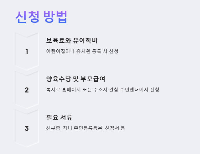 - 보육료와 유아학비: 어린이집이나 유치원 등록 시 신청 절차를 거쳐야 합니다.
