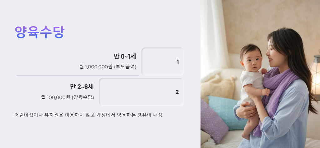 - 만 0~1세: 월 1,000,000원 (부모급여).