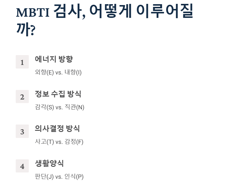 검사는 네 가지 주요 지표를 통해 개인의 성격을 파악하며 4가지 지표들은 다음과 같습니다.