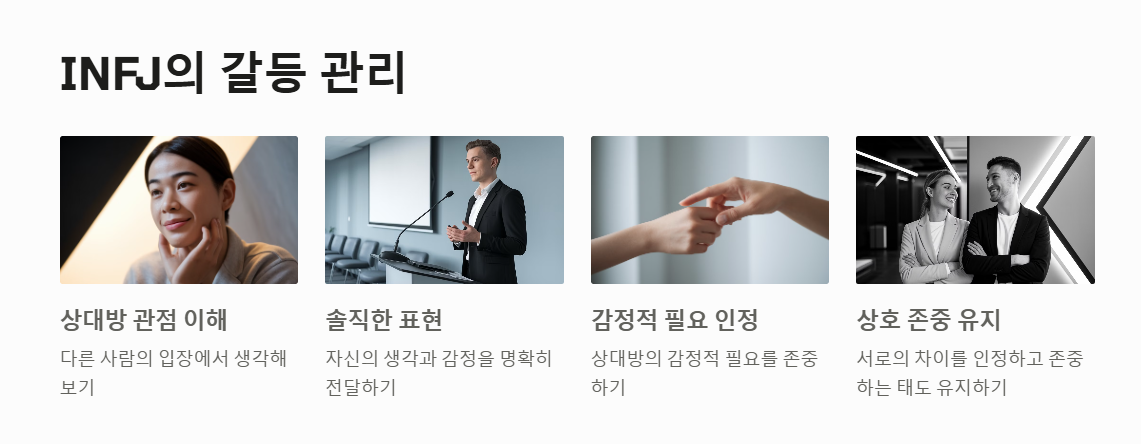 INFJ는 상대방의 관점을 이해하고, 자신의 생각을 솔직하게 표현하는 것이 중요합니다.