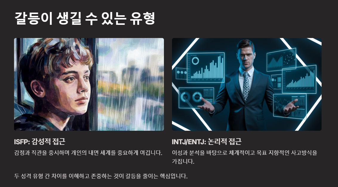 ISFP는 INTJ, ENTJ와 같은 논리적이고 분석적인 유형과 갈등이 생길 수 있습니다. 이들은 감정보다 이성을 중시하기 때문에, 서로의 접근 방식이 다를 수 있습니다.
